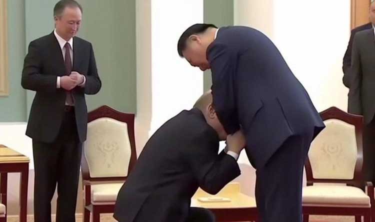وورد في التعليقات التي تضمنتها الصورة، أن بوتين يركع على ركبتيه ويقبل يد الزعيم الصيني في محاولة لإقناعه بشيء ما.