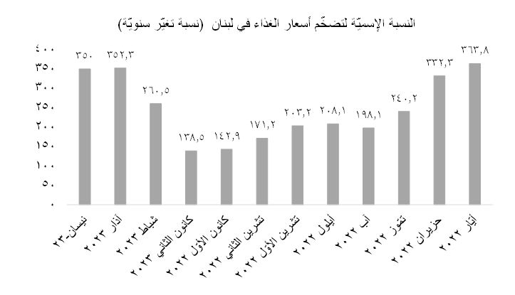 وأشار التقرير الى أنّ البلدان التي عانت من أعلى نسب تضخّم في أسعار الغذاء تقع في القارّة الأفريقيةّ، وشمال أميركا، وأميركا اللاتينيّة، وجنوب آسيا، وأوروبّا وآسيا الوسطى، لافتا الى أنّ نسبة التضخّم الحقيقيّة في أسعار الغذاء (والتي هي كناية عن نسبة التضخّم الإسميّة في أسعار الغذاء ناقص نسبة التضخّم الإجماليّة) قد تخطّت نسبة التضخّم الحقيقيّة الإجماليّة في 84.5% من البلدان ال161 المشمولة في التقرير. وسجّل لبنان أعلى نسبة تضخّم إسميّة في أسعار الغذاء حول العالم بين الفترة الممتدّة بين شهر نيسان 2022 وشهر نيسان 2023 (350% نسبة تغيّر سنويّة في مؤشّر تضخّم أسعار الغذاء)، متبوعاً من الأرجنتين (115%) وزيمبابوي (102%) للذكر لا للحصر. أمّا في ما خصّ نسبة التضخّم الحقيقيّ، فقد بلغت نسبة التغيّر السنويّة في أسعار الغذاء في لبنان 81% في الفترة المذكورة، تبعته فنزويلا (35%) و زيمبابوي (27%)، ورواندا (26%).