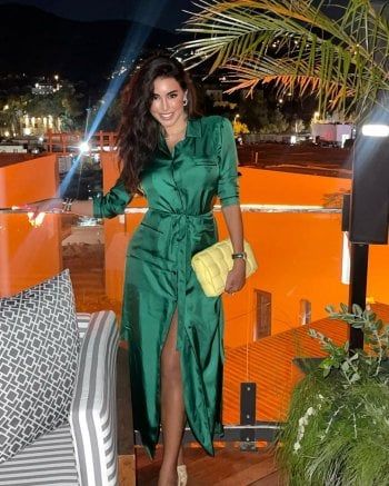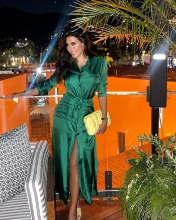 وارتدت ياسمين صبري فستاناً باللون الأخضر القاتم طويل وواسع، بأكمام طويلة، مع شق طويل عند الساق، ونسقت معه حذاء صيفي باللون البيج وحقيبة يد باللون الأصفر، مع مجموعة أكسسوارات أضافت للإطلالة رونقاً خاصاً.