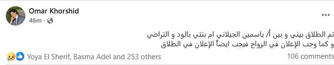 وقال عمر خورشيد، عبر حسابه على فيسبوك: تم الطلاق بيني وبين ياسمين الجيلاني أم بنتي بالود والتراضي، وكما وجب الإعلان في الزواج، فيجب أيضا الإعلان في الطلاق.