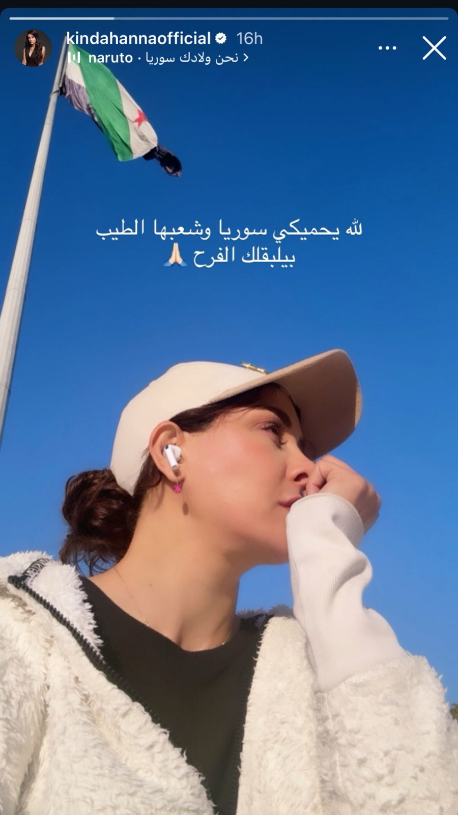 "اللّه يحميكي سوريا وشعبها الطيب، يبلّقلك الفرح"، مرفقة الصورة مع العلم السوري في الخلفية، في إشارة إلى تمنياتها بالأمن والسلام والاستقرار لأهل سوريا.