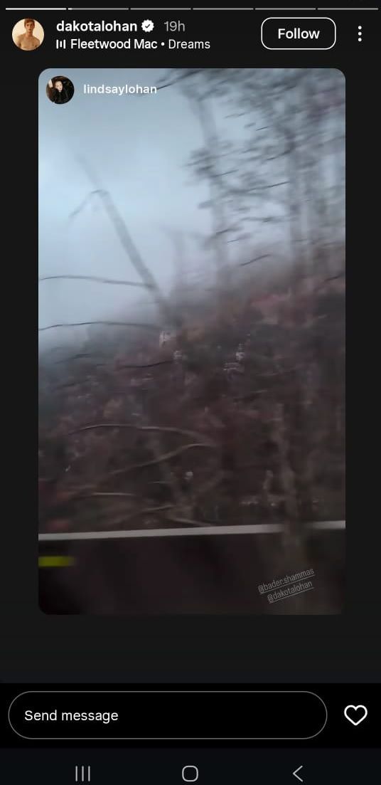 ووثقت ليندسي من خلال فيديو نشرته عبر خاصية "ستوري" عبر حسابها على "انستغرام"، جولتها في لبنان، في منطقة جبليّة. أما شقيقها داكوتا، فنشر أيضاً صورة علّق عليها قائلاً "هذه ليست أميركا"، وأخرى من غابة أرز الباروك. Advertisement