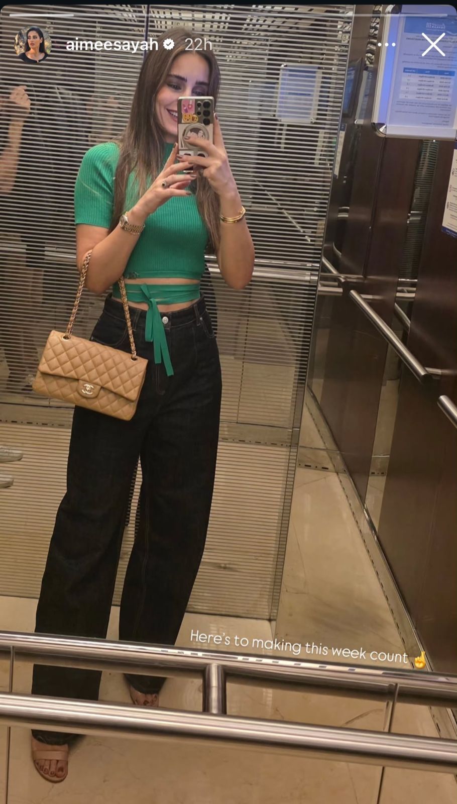 واعتمدت إيميه تنسيقاً بسيطاً جمع بين القميص الأخضر القصير والبنطال الأسود الواسع، مع حقيبة يد باللون البيج، ما أضفى على إطلالتها لمسة شبابية وعصرية. وأرفقت الصورة بتعليق بالإنكليزية قالت فيه: “Here’s to making this week count”، في إشارة إلى طاقة إيجابية وبداية أسبوع مليئة بالحيوية.