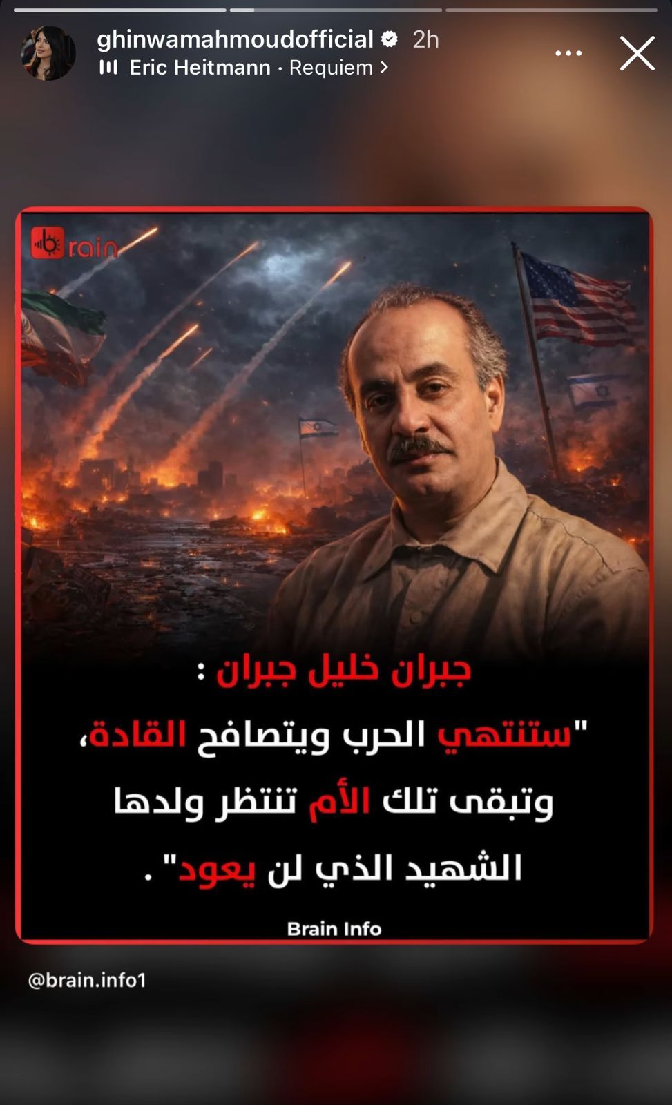 شاركت الممثلة غنوة محمود ستوري مؤخرًا عبر حسابها الرسمي على إنستغرام، تضمنت اقتباسًا مؤثرًا لجبران خليل جبران يعبر عن معاناة الحرب وآثارها الإنسانية، حيث جاء فيه:
