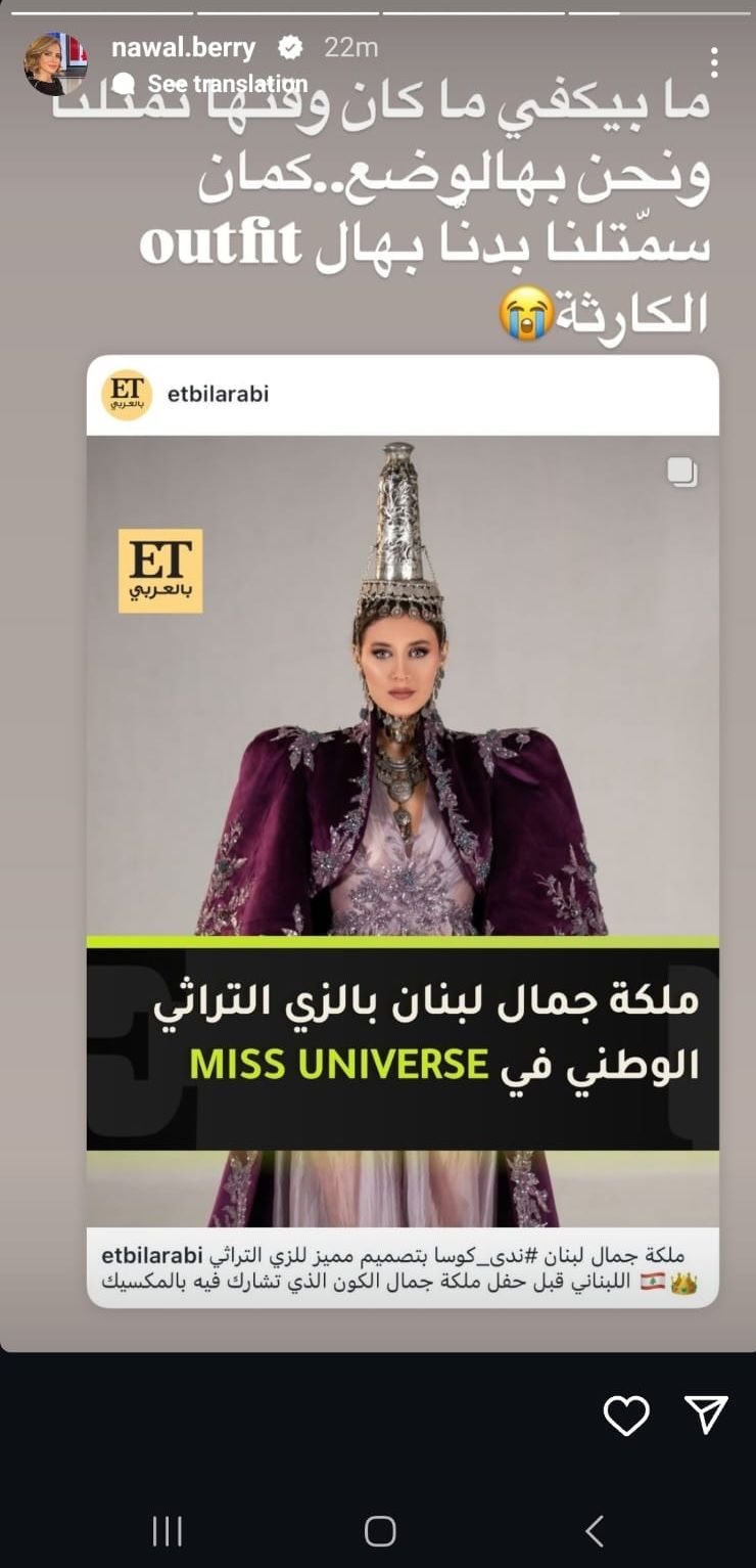 وكتبت عبر خاصيّة “ستوري” عبر حسابها على “انستغرام”: ما بيكفي ما كان وقتها تمثلنا ونحن بهالوضع.. كمان سمّتلنا بدنا بهال outfit الكارثة”.
