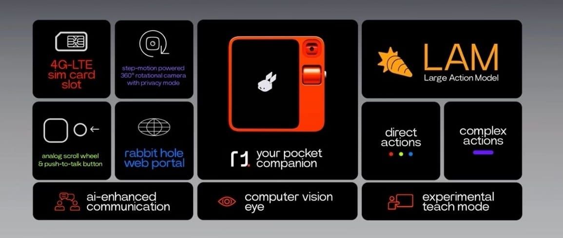 كشفت شركة (Rabbit) عن جهازها الذكي الأول (Rabbit R1) يوم الأربعاء الماضي خلال مشاركتها في معرض CES 2024، وهو جهاز صغير الحجم يعتمد على الذكاء الاصطناعي لإنجاز المهام دون الحاجة إلى استخدام أي تطبيقات، إذ يعتمد في عمله على الأوامر الصوتية، ومن المنتظر أن تصل الدفعة الأولى إلى الأسواق في شهر مارس المقبل، ويُباع الجهاز بسعر قدره 199 دولارًا فقط.