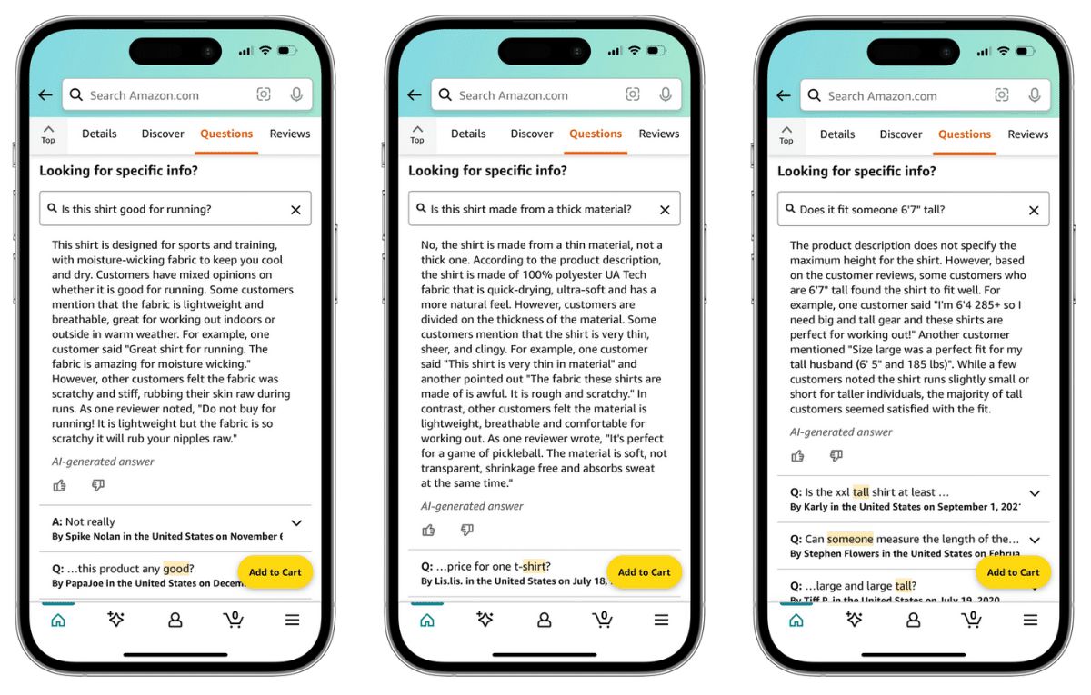 وتطالب الميزة الجديدة في تطبيق أمازون للهاتف المحمول المستخدمين بطرح أسئلة بخصوص عنصر معين، ومن ثم تعيد الإجابة في غضون ثوانٍ قليلة، وذلك بشكل أساسي عن طريق تلخيص المعلومات التي تجمعها من مراجعات المنتج والقائمة نفسها.