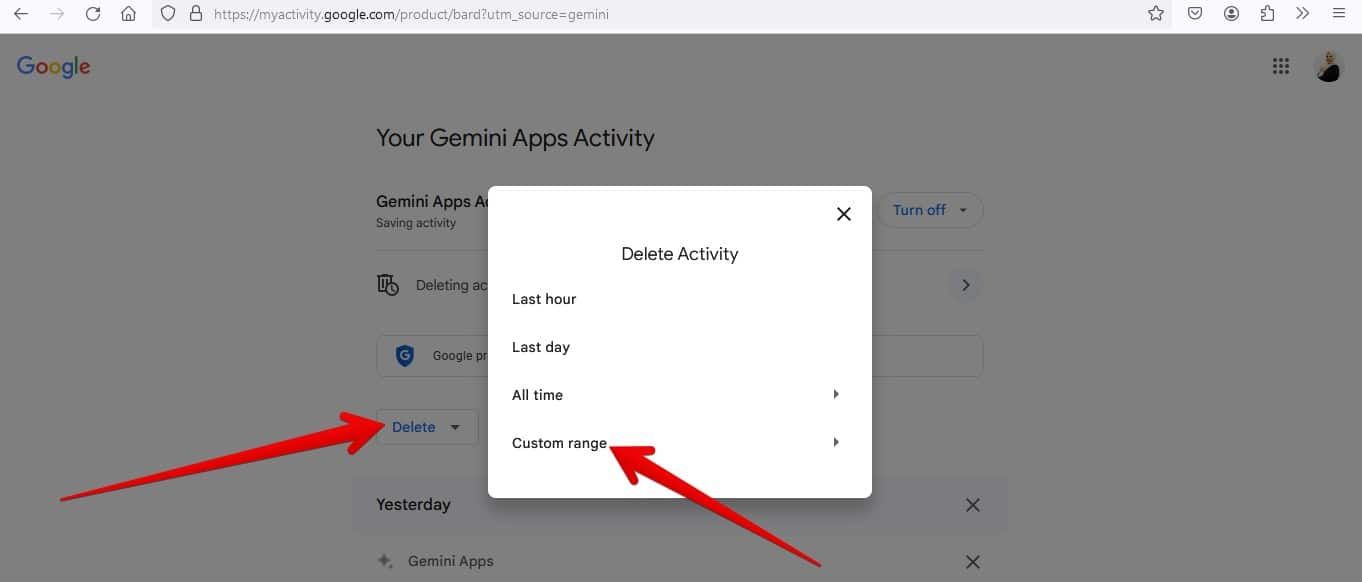 - ستنتقل إلى صفحة سجل نشاطك في تطبيقات Gemini، حيث يمكنك مراجعة طلباتك، وحذف جميع المحادثات خلال مدة زمنية محددة، أو حذف سجل نشاطك بالكامل، أو تغيير إعدادات الحذف التلقائي.