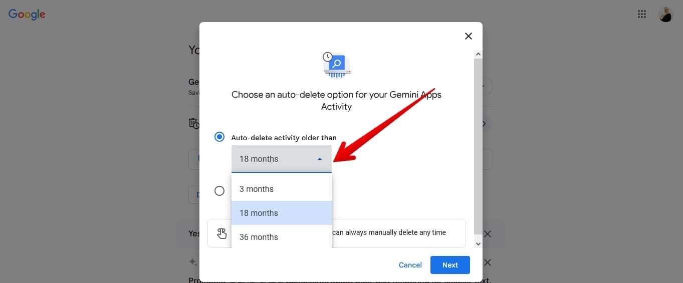 - لتغيير إعدادات الحذف التلقائي لنشاطك في Gemini، اضغط على خيار (حذف النشاط الأقدم من) Deleting activity older than. سيظهر لك ثلاثة خيارات، وهي: ثلاثة أشهر، أو 18 شهرًا – الخيار الافتراضي – أو 36 شهرًا كإطار زمني للحذف التلقائي، أو يمكنك ببساطة إلغاء الاشتراك في حذف بياناتك تلقائيًا، بتحديد خيار (لا تحذف النشاط تلقائيًا) Don’t auto-delete activity.