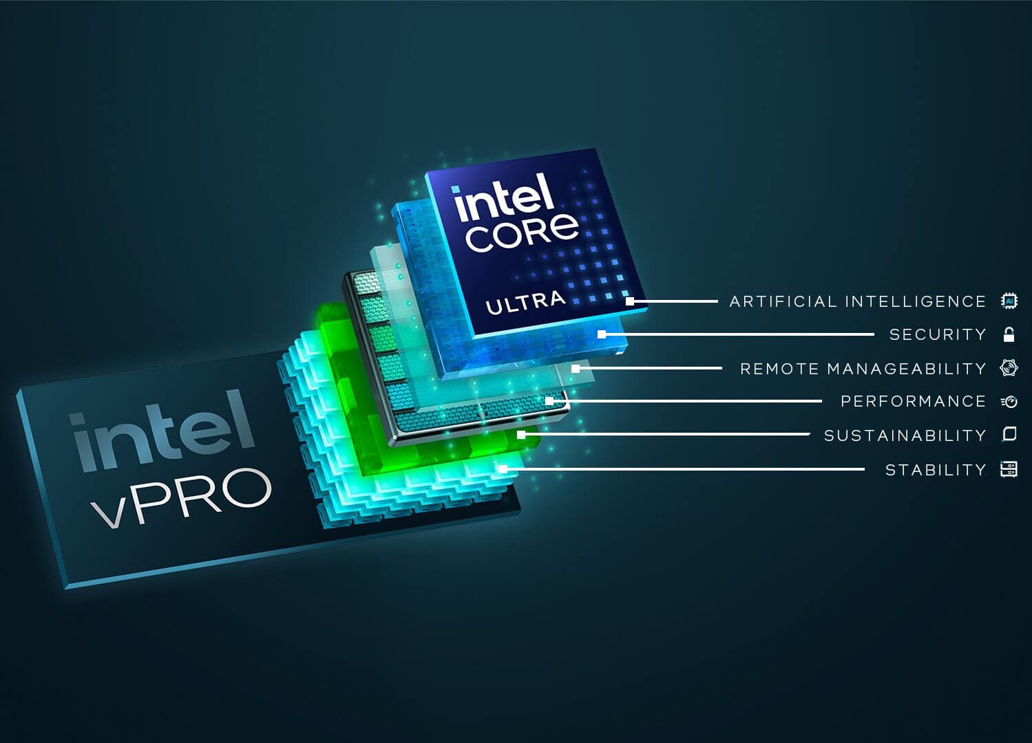 وتشمل المزايا الجديدة في تقنية الأمان vPro اكتشافًا للتهديدات باستخدام وحدة المعالجة العصبية (NPU) لتحسين كفاءة اكتشاف الثغرات، كما أنها تستخدم الذكاء الاصطناعي لتحسين أحمال العمل. وتضيف طبقة إضافية لنظام التشغيل تُستخدم لاكتشاف التهديدات المستندة إلى الذكاء الاصطناعي.