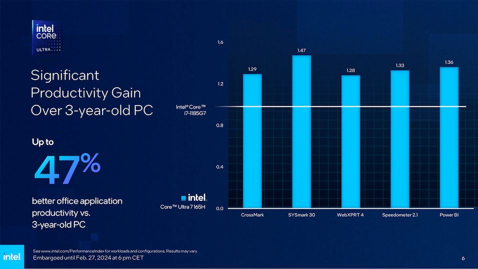 وقالت إنتل إنها تتوقع أن يرى العملاء بفضل هذه المعالجات الجديدة مكاسب بنسبة تصل إلى 47% في إنتاجية التطبيقات مقارنة بجهاز حاسوب عمره ثلاث سنوات.
