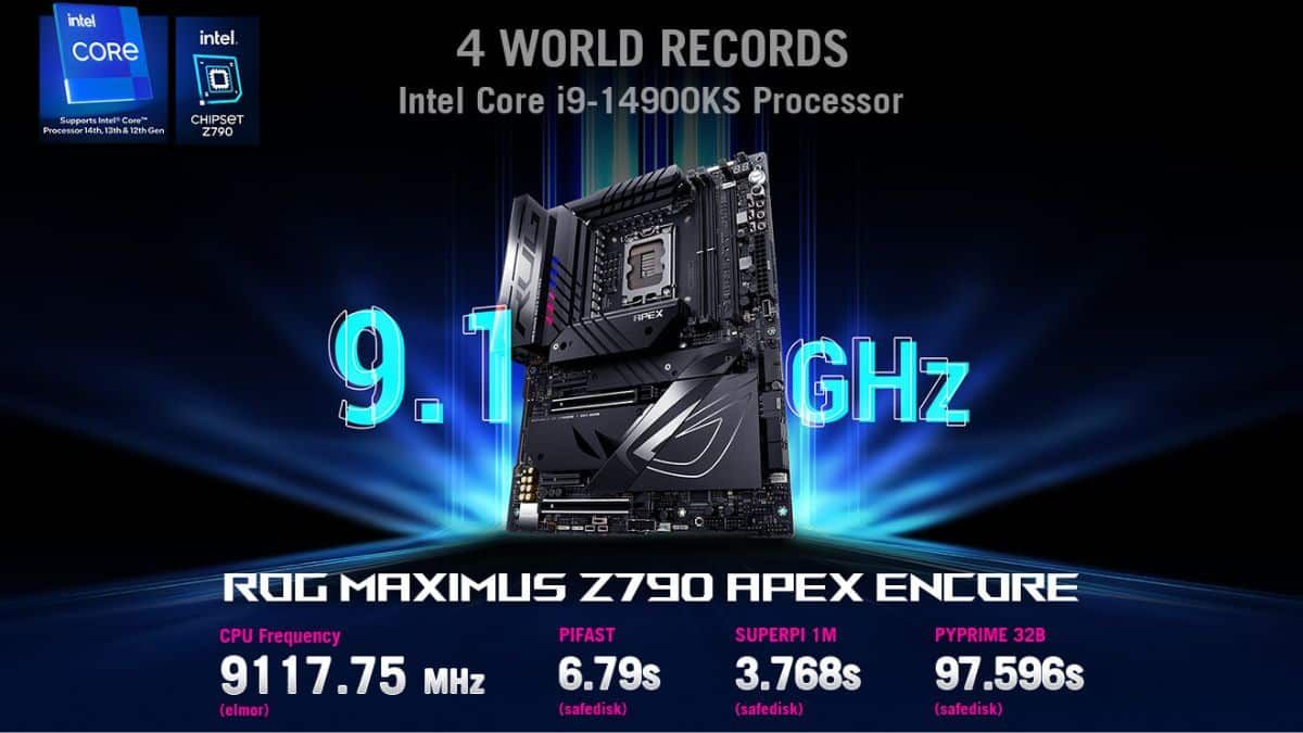 أعلنت شركة أسوس تحطيمها أربعة أرقام عالمية باستخدام اللوحة الأم ROG Maximus Z790 Apex Encore المزودة بالمعالج المركزي إنتل Core i9-14900KS الذي أطلق في الآونة الأخيرة.