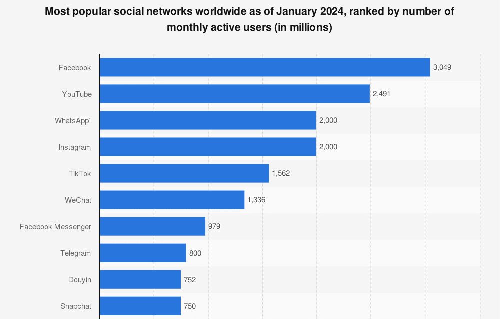 إليك أكثر شبكات التواصل الاجتماعي شعبية على مستوى العالم اعتبارًا من يناير 2024، مرتبة حسب عدد المستخدمين النشطين شهريًا: