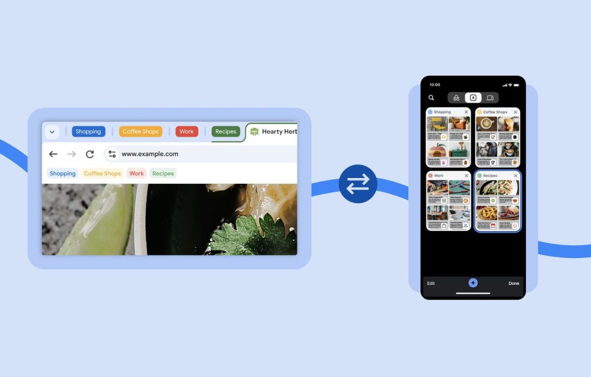وعلى سبيل المثال، إذا بدأ مستخدمو كروم بالتخطيط للإجازة عبر الهاتف، فإن بإمكانهم بعد ذلك تجميع علامات التبويب المفتوحة هذه معًا ومزامنتها تلقائيًا مع حساب الحاسوب المكتبي إذا أرادوا الانتقال إلى شاشة كبيرة. وتقول جوجل إن هذا التحديث سيأتي إلى كروم عبر نظام التشغيل iOS قريبًا.