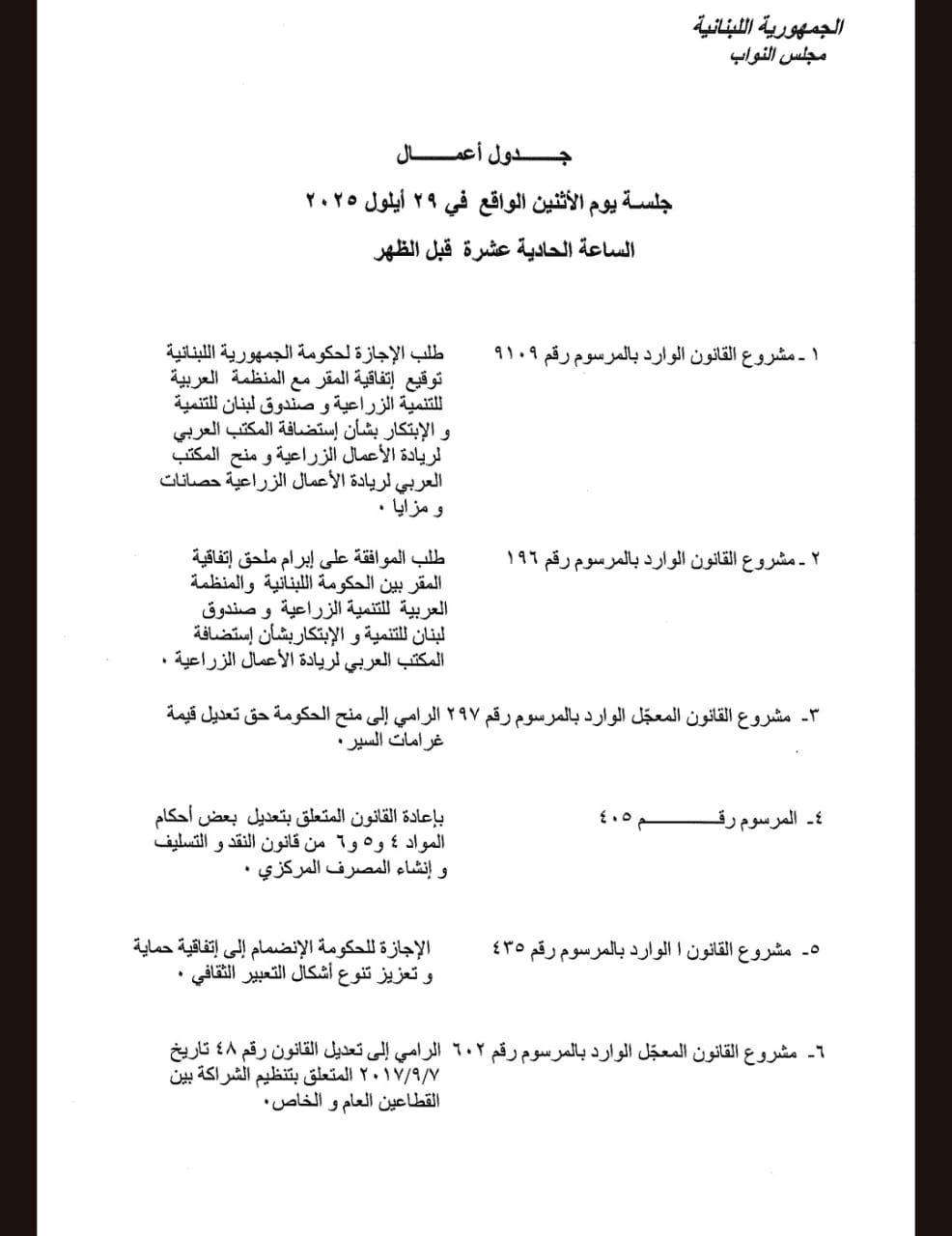 يعقد مجلس النواب جلسة تشريعية في تمام الساعة 11:00 من قبل ظهر يوم الYثنين المقبل، وذلك لدرس مشاريع واقتراحات القوانين المدرجة على جدول الأعمال التالي: