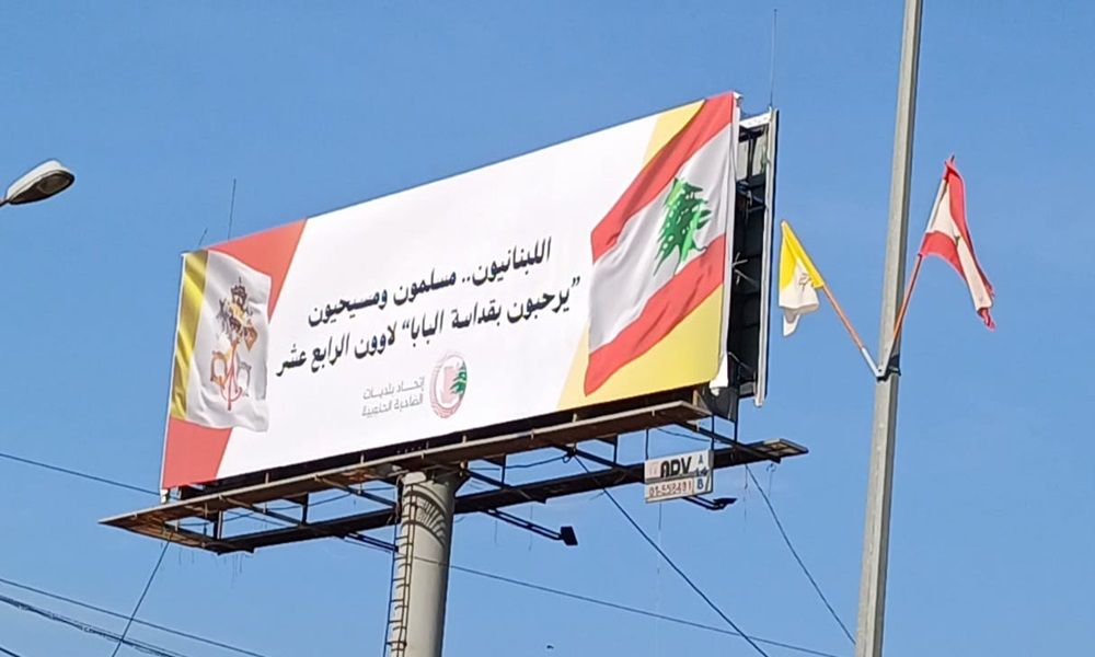 رفع اتحاد بلديات الضاحية الجنوبية لافتة كبيرة دوّن عليها: اللبنانيون… مسلمون ومسيحيون يرحبون بقداسة البابا لاوون الرابع عشر”.