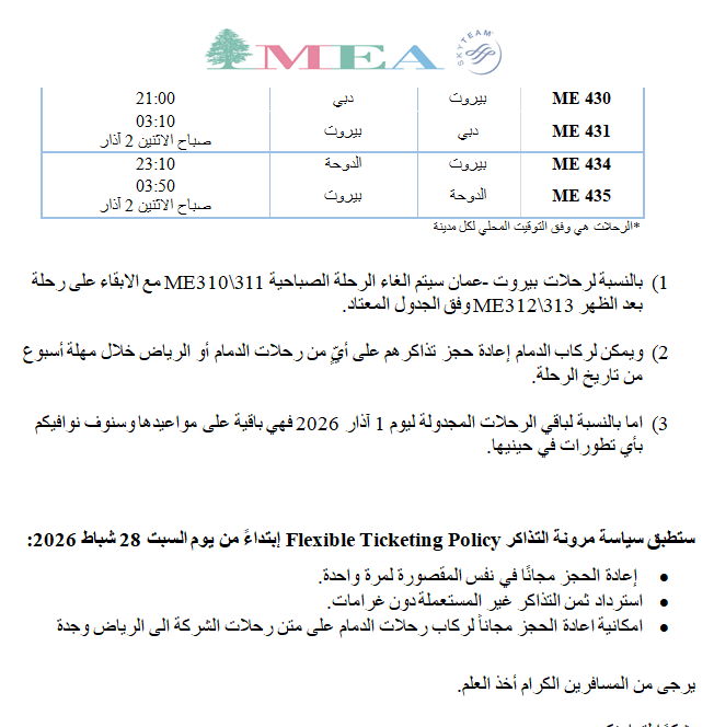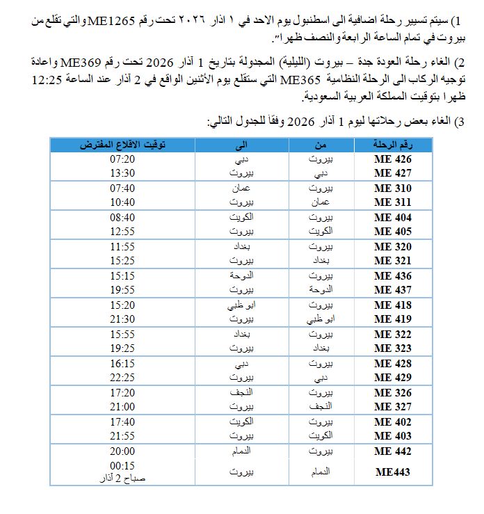 أصدرت شركة طيران الشرق الأوسط بيانا، أعلنت فيه تعديلات على بعض الرحلات، وذلك بسبب اغلاق المجالات الجوية في معظم دول المنطقة نتيجة التطورات السائدة. اليكم بيان شركة طيران الشرق الأوسط.