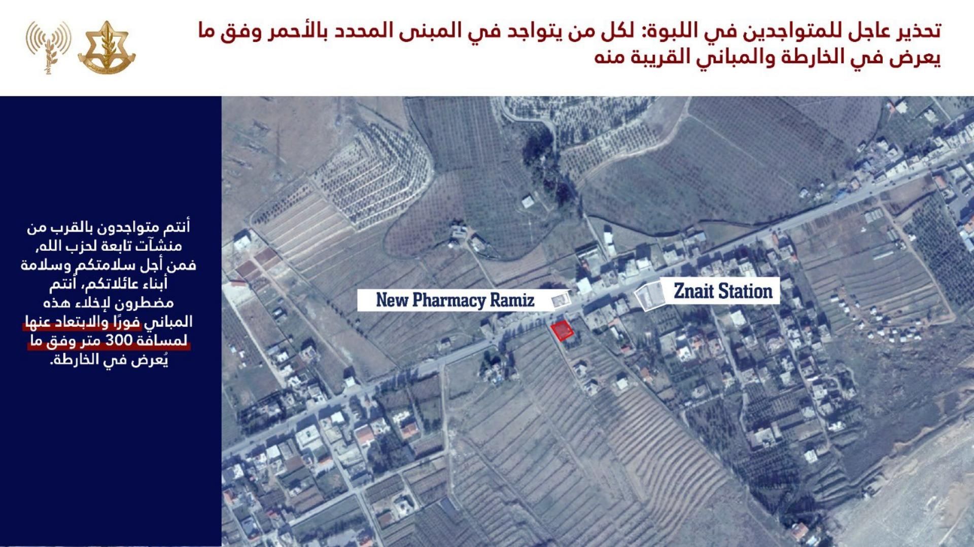 وأضاف: “نحث سكان المباني المحددة بالأحمر في الخرائط المرفقة والمباني المجاورة لها: أنتم تتواجدون بالقرب من مباني يستخدمها “حزب الله” فمن أجل سلامتكم أنتم مضطرون لإخلائها فورًا والابتعاد عنها لمسافة لا تقل عن 300 متر. البقاء في منطقة المباني المحددة يعرضكم للخطر”.