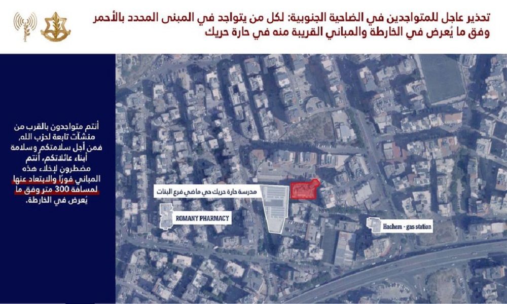 وقال: “لكل من يتواجد في المبنى المحدد بالأحمر وفق ما يُعرض في الخارطة والمباني المجاورة له: أنتم تتواجدون بالقرب من منشآت تابعة لحزب الله. من أجل سلامتكم وسلامة أبناء عائلاتكم أنتم مضطرون لإخلاء هذه المباني فوراً والابتعاد عنها لمسافة لا تقل عن 300 متر وفق ما يُعرض في الخارطة”.