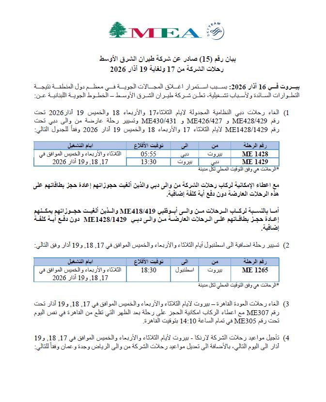 أعلنت شركة طيران الشرق الأوسط – الخطوط الجوية اللبنانية رقم (15) أنه بسبب استمرار إغلاق المجالات الجوية في معظم دول المنطقة نتيجة التطورات السائدة، ولأسباب تشغيلية، تقرّر إلغاء عدد من الرحلات النظامية بين بيروت ودبي المقررة بين 17 و19 آذار 2026.